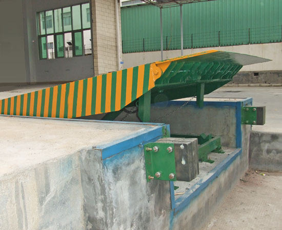 定义: 货台高度调节板是工业物流搬运与装卸的辅助设备之一。通常(嵌入)安装于装卸货码头中,起到调节装卸货码头与运输卡车之间的高度差和间隙。保障搬运工具(如机动叉车或手动液压托盘搬运车)能够畅通无阻地出入卡车车厢进行物料的装卸工作。 结构与工作原理: 结构:主要有三个部分,底座、承载板和动力系统。 底座与装卸货台固定,承载板分主板与搭板,使用时由动力系统升起主板,在主